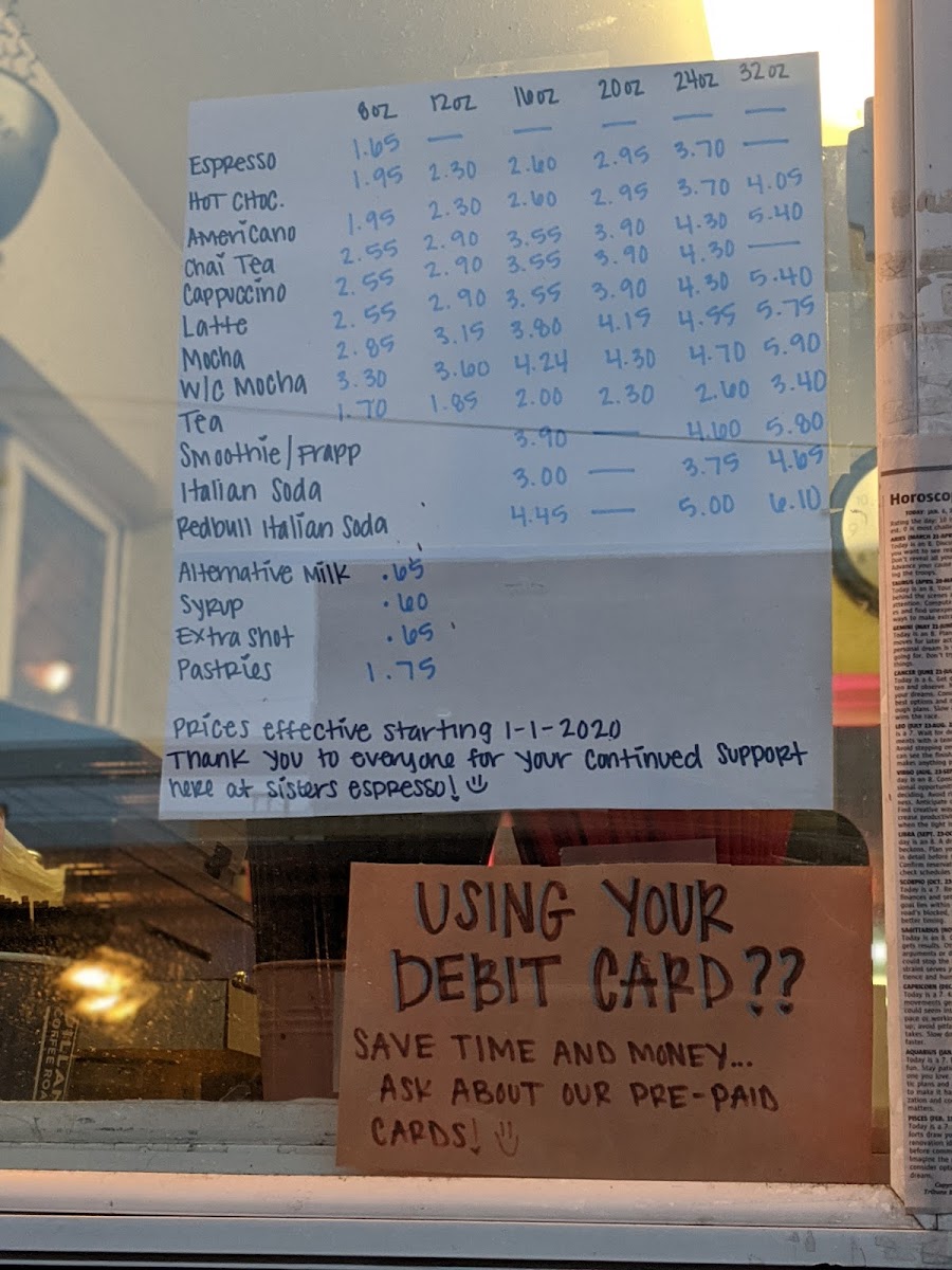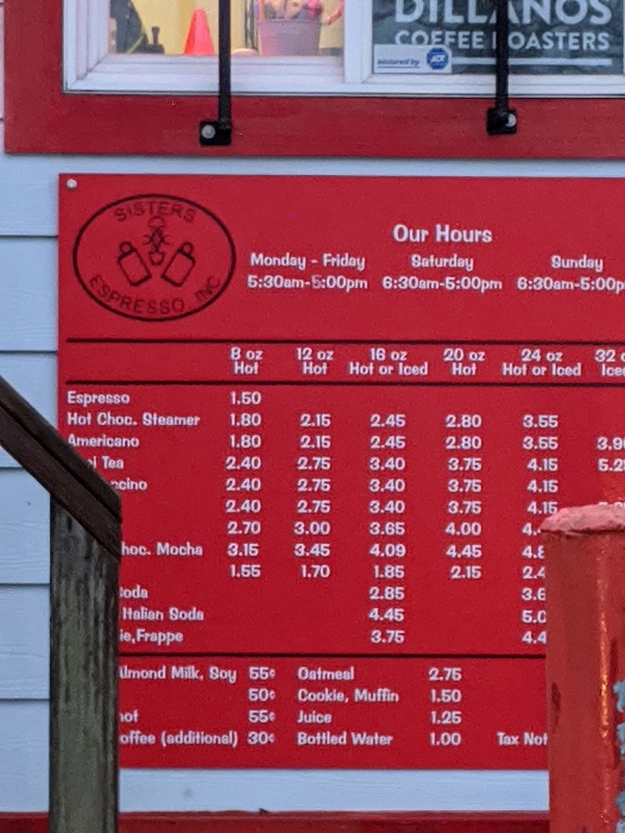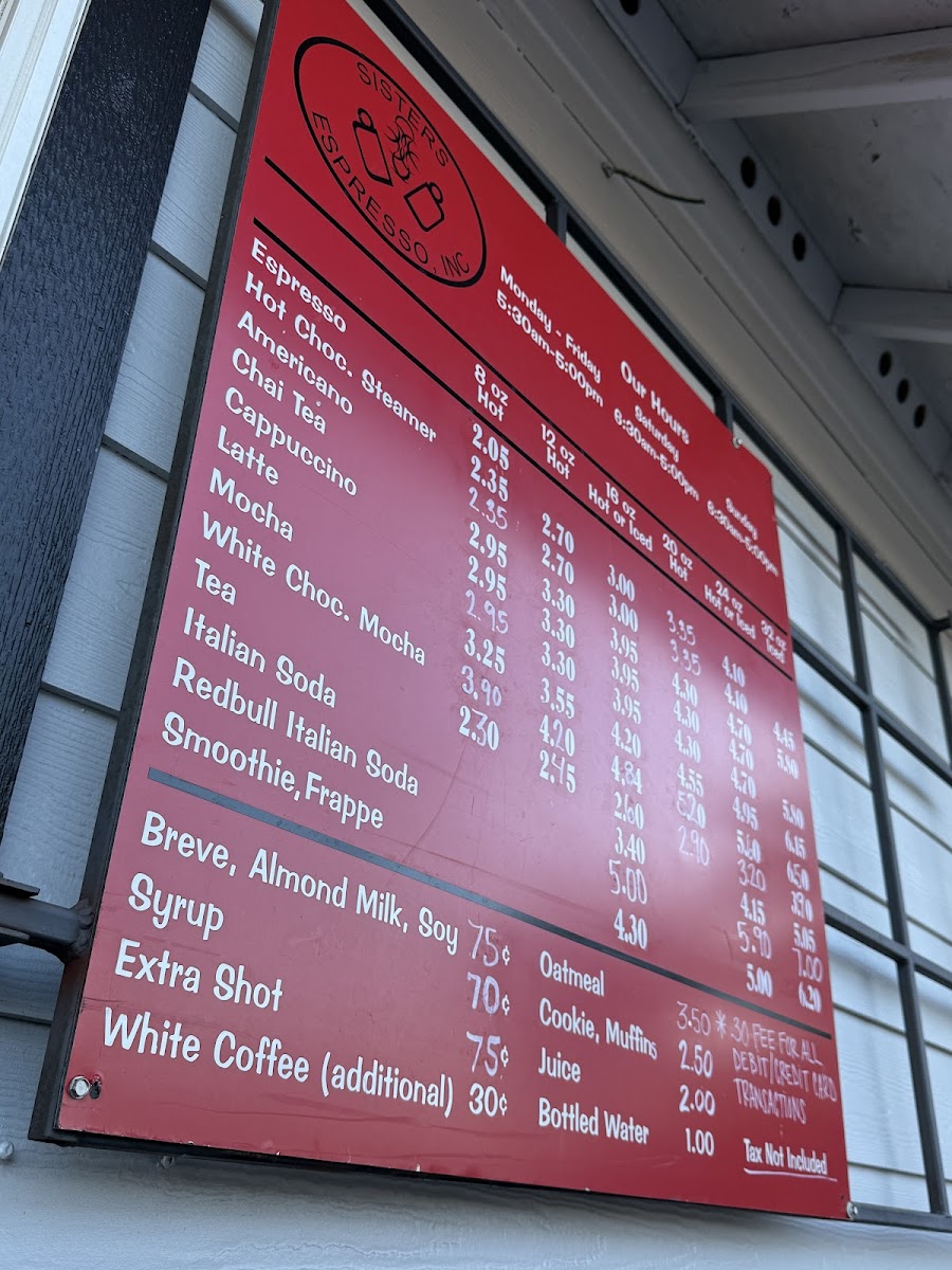 The menu at Sisters' Espresso Inc primarily features a selection of coffee and espresso beverages, along with specialty drinks. Visitors can expect various coffee options, including lattes and decaffeinated choices, served with different milk alternatives such as oat milk. In addition to traditional coffee offerings, the menu includes Italian sodas with flavored syrups.